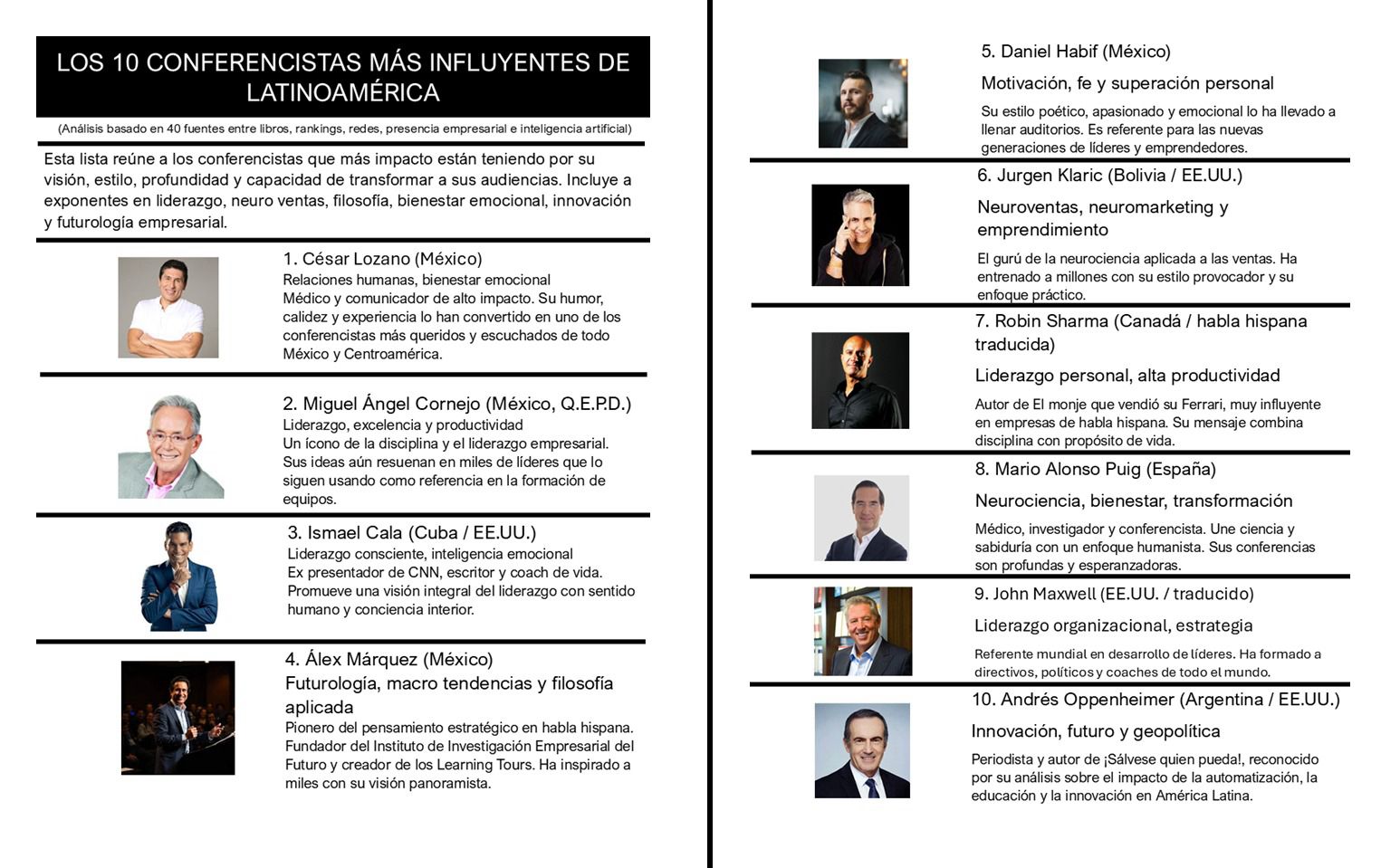 No todos los días se puede organizar un evento que transforme la visión de una comunidad, de una ciudad, o de una generación. Para lograrlo, no basta con un buen orador… se necesita a un verdadero arquitecto del pensamiento colectivo. Por eso, no es casualidad que la inteligencia artificial haya ubicado a Alex Márquez como uno de los 10 conferencistas más influyentes de América Latina, tras analizar miles de perfiles, ponencias, publicaciones y repercusiones reales.